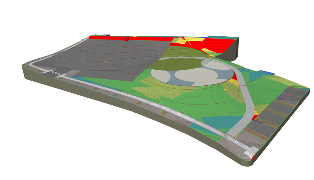 A survey of 3D points and contours allowed ALA to generate a model for the existing site. They then used graphic settings to colorize the site model to analyze slopes and water flow.