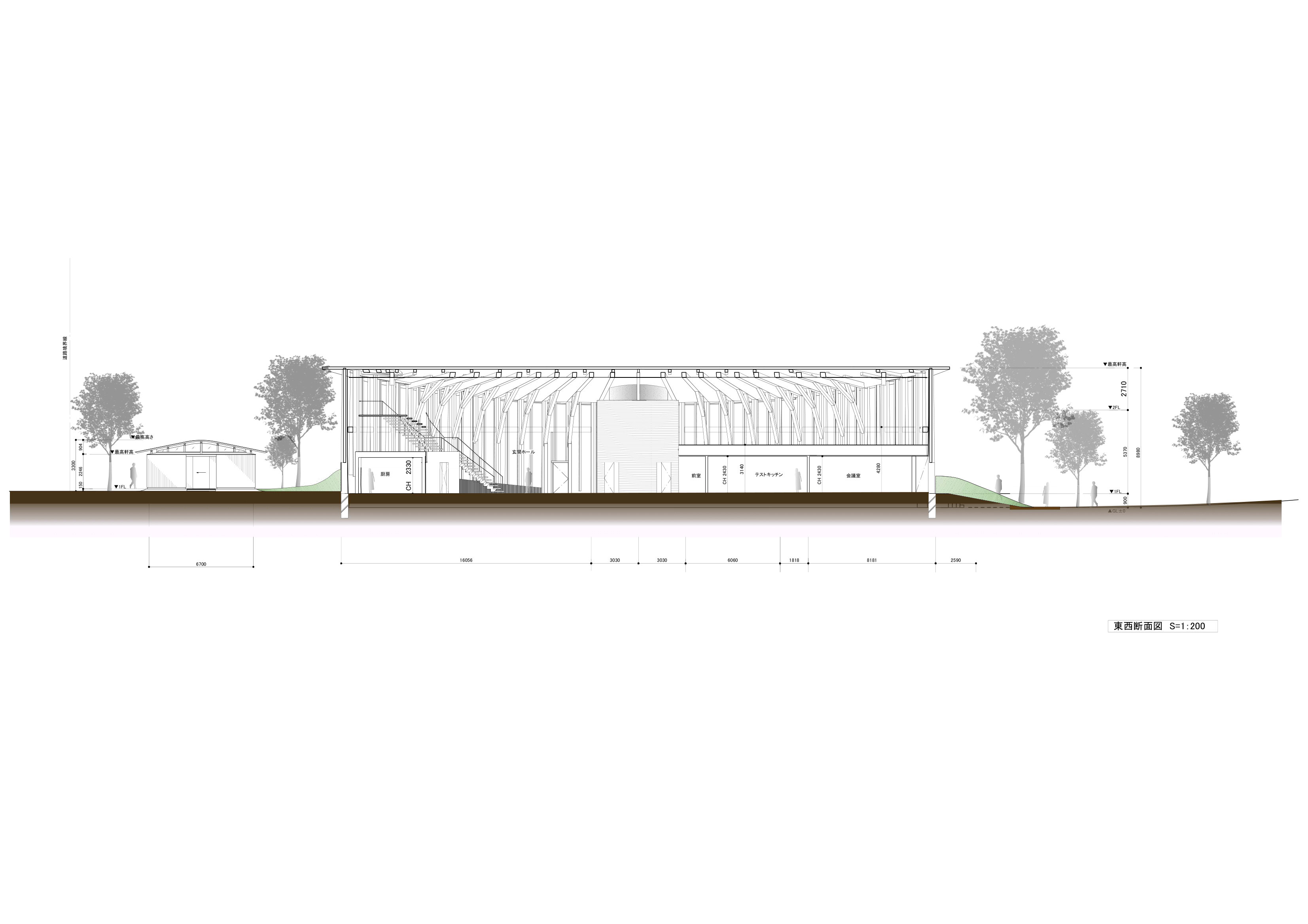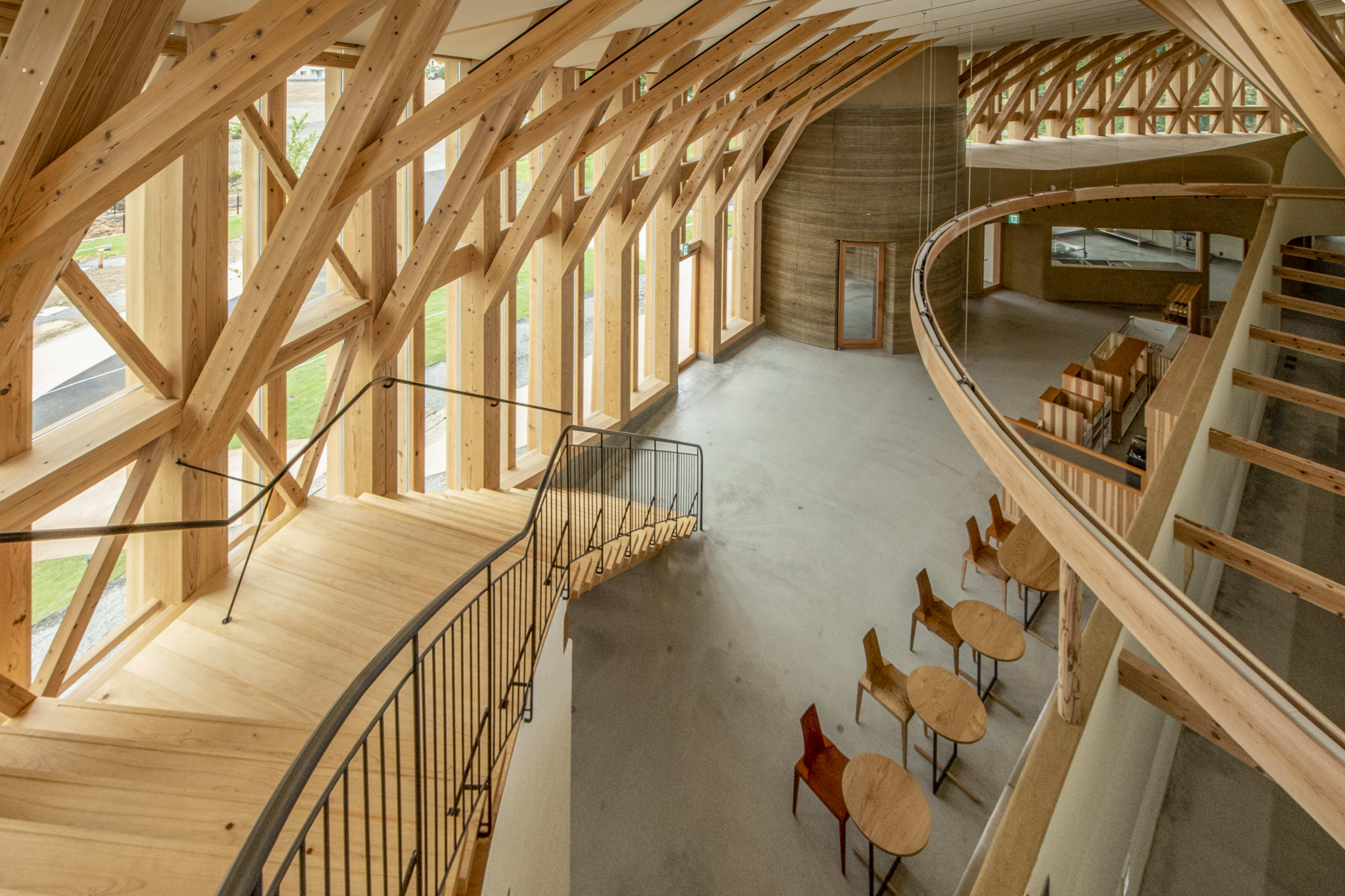 The symbolic, circular main hall is surrounded by a colonnade of timber columns and enclosed by a wood frame and glass curtain wall. The wood used is almost 100% solid cedar and cypress from Neba-mura, Nagano Prefecture.