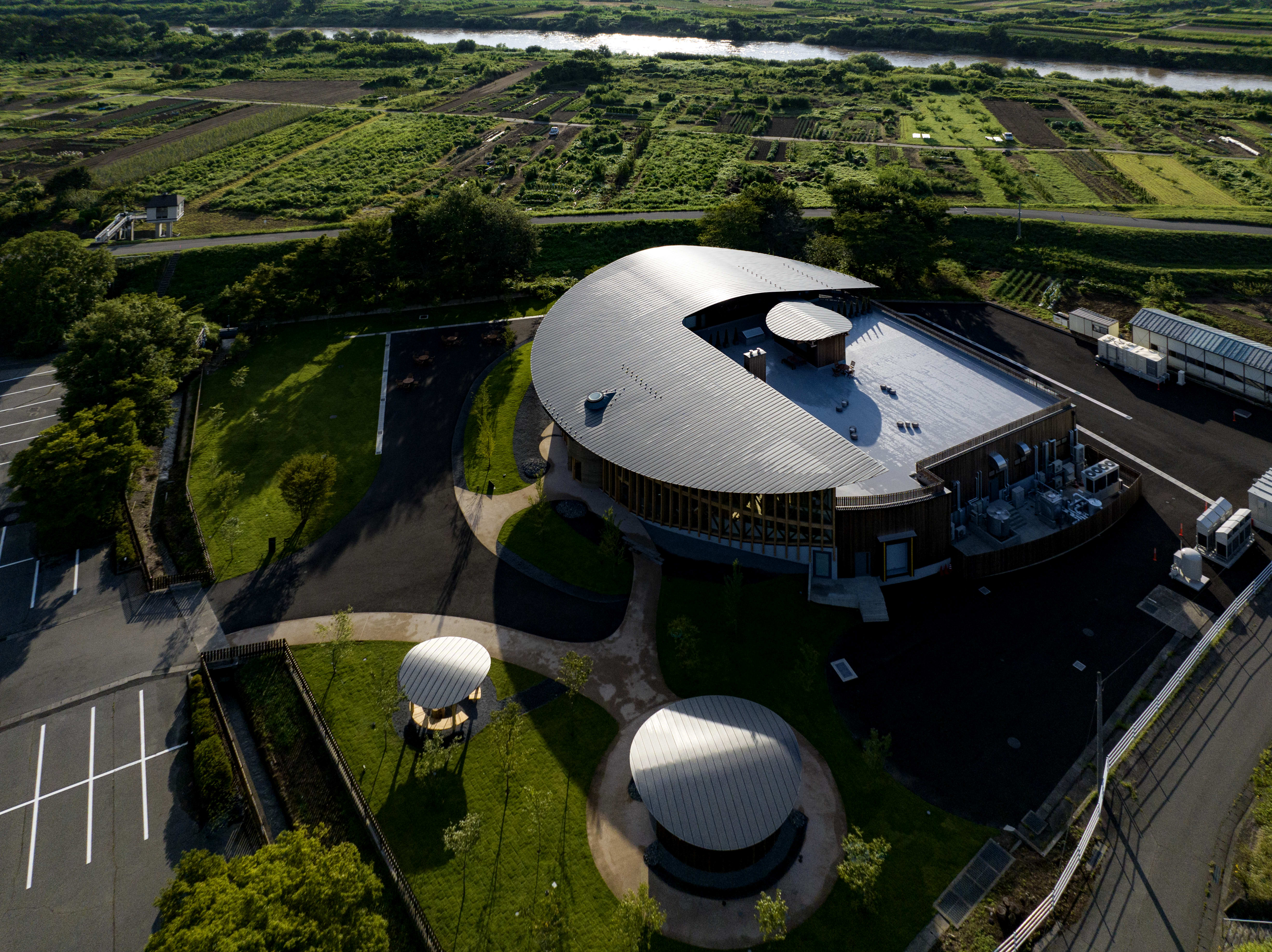 The roof is a large, softly curved structure created using advanced hand-chiseling techniques. The arc-shaped roof, designed to meet Japan's primary energy consumption standards, harmonizes beautifully with the surrounding mountains.
