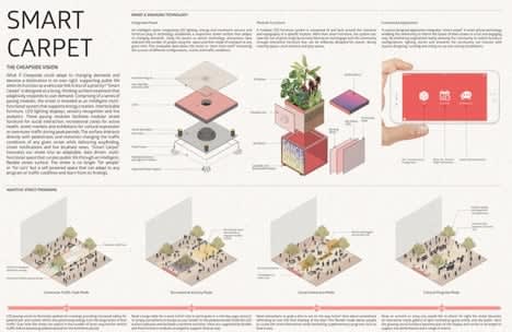 Furthermore, the Smart Carpet design implements sensory recognition analysis to collect traffic and pedestrian data in real time. Almost eerily, the city itself would know when pedestrian traffic peaks and when the roads are used more for commuters.